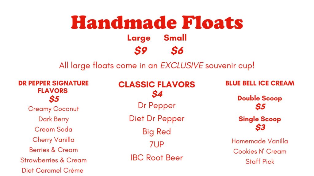 Did you know we are the Original Home of the Dr Pepper Float? If you’re here because you love Dr Pepper, a Dr Pepper Float is a MUST! To upgrade to a float, present your drink voucher to our Soda Fountain staff and let them know you want to upgrade. Your voucher gets you $1 off a small or large float.